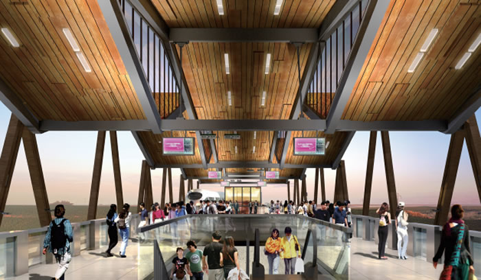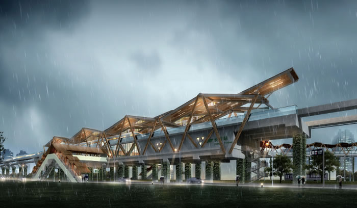 “山水重慶”是10號(hào)線的概念性主題,設(shè)計(jì)從基本功能空間出發(fā),將站廳層、站臺(tái)層、屋面對(duì)應(yīng)重慶山水格局中的江岸、人居空間、山巒地貌,從而映照“山水重慶”抽象概念。同時(shí),設(shè)計(jì)傳承傳統(tǒng)巴渝建筑中的支撐結(jié)構(gòu),結(jié)合現(xiàn)代建筑手法,使用木材、剛才、竹膠合板等綠色建筑材料,讓“山水重慶”的空間概念在高架車站中立體呈現(xiàn)。
