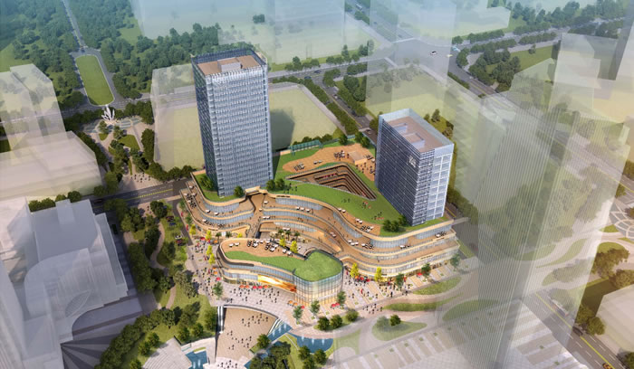 遵循核心區(qū)總體城市設(shè)計框架,結(jié)合地形與城市建筑群體空間環(huán)境,合理規(guī)劃布局。強調(diào)商業(yè)動線的合理性與流動性,將城市商業(yè)步行街與建筑主要出入口無縫銜接,將建筑與城市廣場融為一體。著力塑造城市公共界面的都市商業(yè)綜合體建筑形象,以現(xiàn)代簡潔的造型和高品質(zhì)的外墻材料充分體現(xiàn)城市核心的總體印象。分析綜合建筑群的功能個性、考慮各種功能業(yè)態(tài)的使用要求,合理安排各種流線,創(chuàng)造舒適、優(yōu)美、高效的商業(yè)、辦公環(huán)境。通過對地塊及周邊環(huán)境的分析,利用東西高差,在西北側(cè)形成吊層商業(yè)。整體布局是將1#辦公樓布置在東北面,緊鄰金龍大道,將2#辦公布置在西南面靠步行街口部位置,讓兩棟塔樓都能獲得優(yōu)越的昭示性和可達性;西北角面向中心下沉廣場布置獨立商業(yè)體,結(jié)合南面和東面形成統(tǒng)一、整體、大氣的商業(yè)界面。