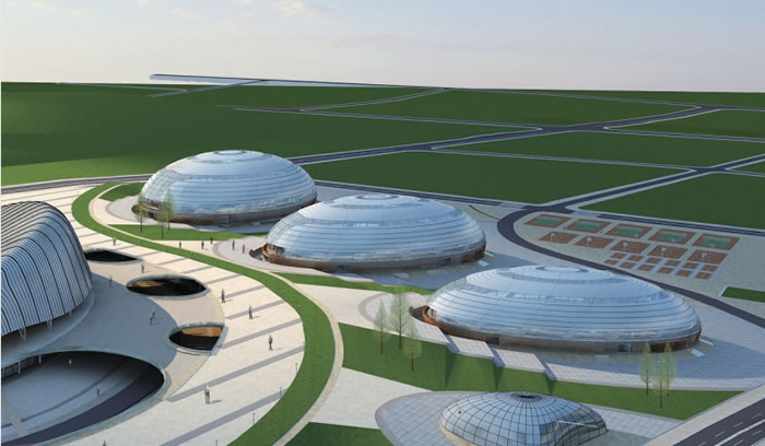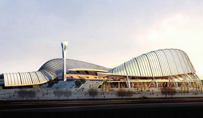 在傳統(tǒng)的中國(guó)文化中,魚是吉祥富貴的象征。因此在主體育場(chǎng)的建筑造型設(shè)計(jì)中,我們從魚身上抽象出體育場(chǎng)屋頂?shù)脑煨?,使看臺(tái)屋面猶如兩條歡騰的錦鯉從地平線上一躍而起,與自然環(huán)境融為一體。其靈動(dòng)的曲面,在象征了合川魚文化特色的同時(shí),也體現(xiàn)出一種魚躍龍門,活力向上的運(yùn)動(dòng)生機(jī)。其次在體育館的設(shè)計(jì)中,其造型則抽象于水滴的形態(tài),蘊(yùn)含了合川的地域文化特征,同時(shí)也體現(xiàn)出一種生命之源的寓意,另外其機(jī)理變化的表皮則體現(xiàn)了魚鱗的意象,使之與旁邊的體育場(chǎng)相印生輝。